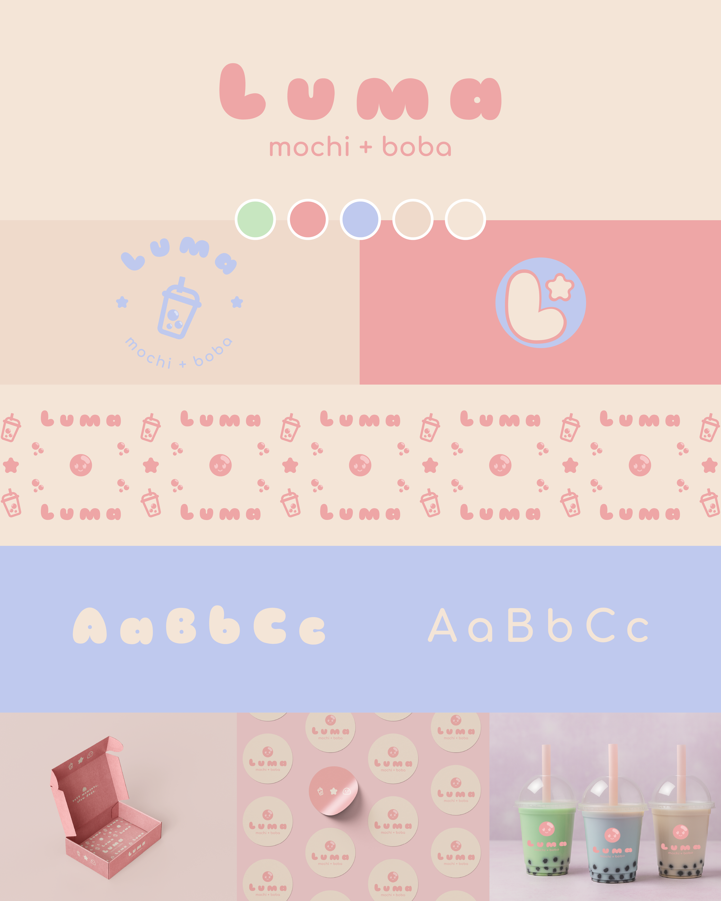 Brand Board - 2025 Suunnittelin kuvitteelliselle Luma Mochi + Boba -kahvilalle pehmeän ja leikkisän brändi-ilmeen, joka yhdistää pastellisävyt ja selkeän muotokielen lämpimäksi, helposti lähestyttäväksi kokonaisuudeksi.