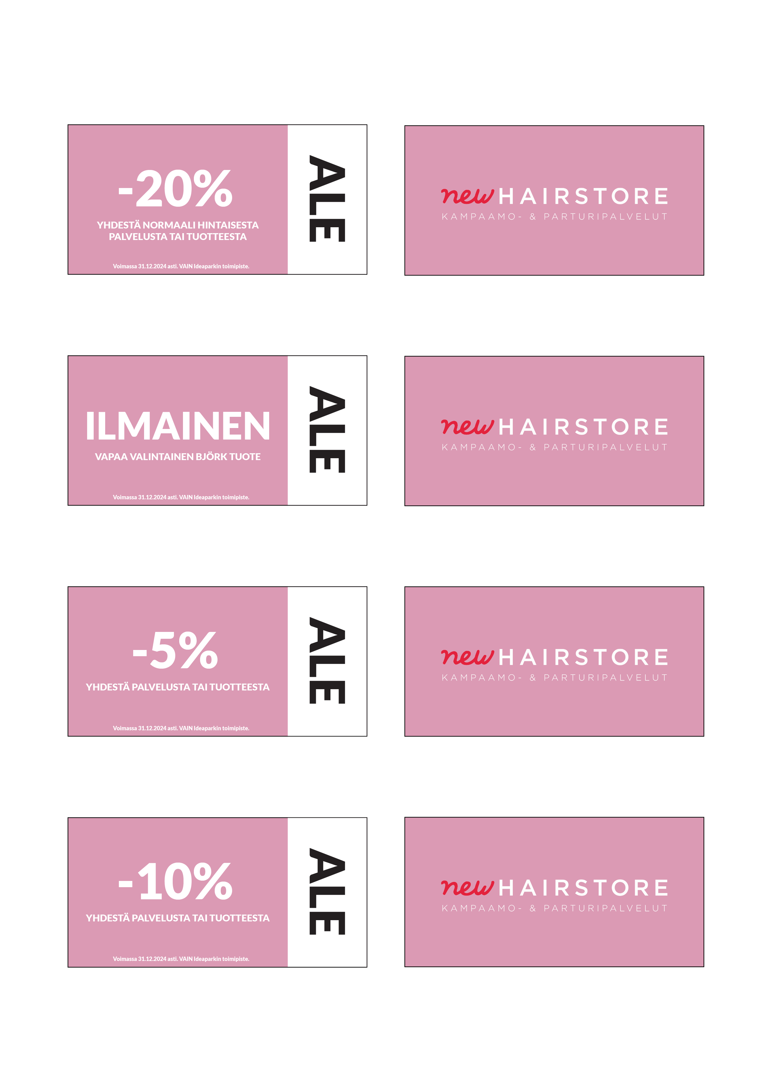 Alennuskupongit - 2024 Suunnittelin kampanjakupongit New hairstoren palkintopyörää varten Ideaparkin Tasauspäivien yhteydessä. Toteutin eri alennuksia varten visuaalisesti yhtenäiset kupongit, jotka mukailevat tapahtuman värimaailmaa.